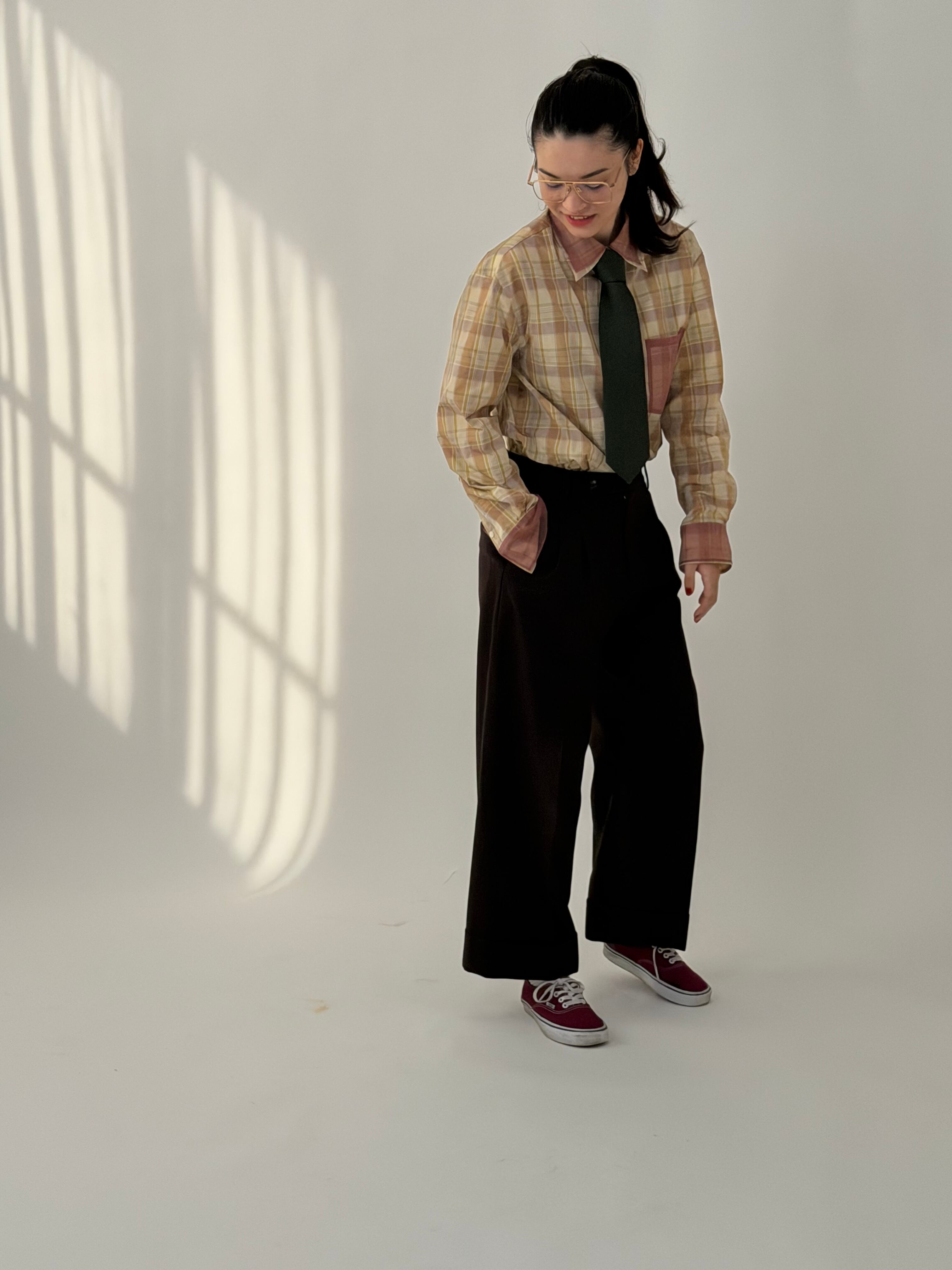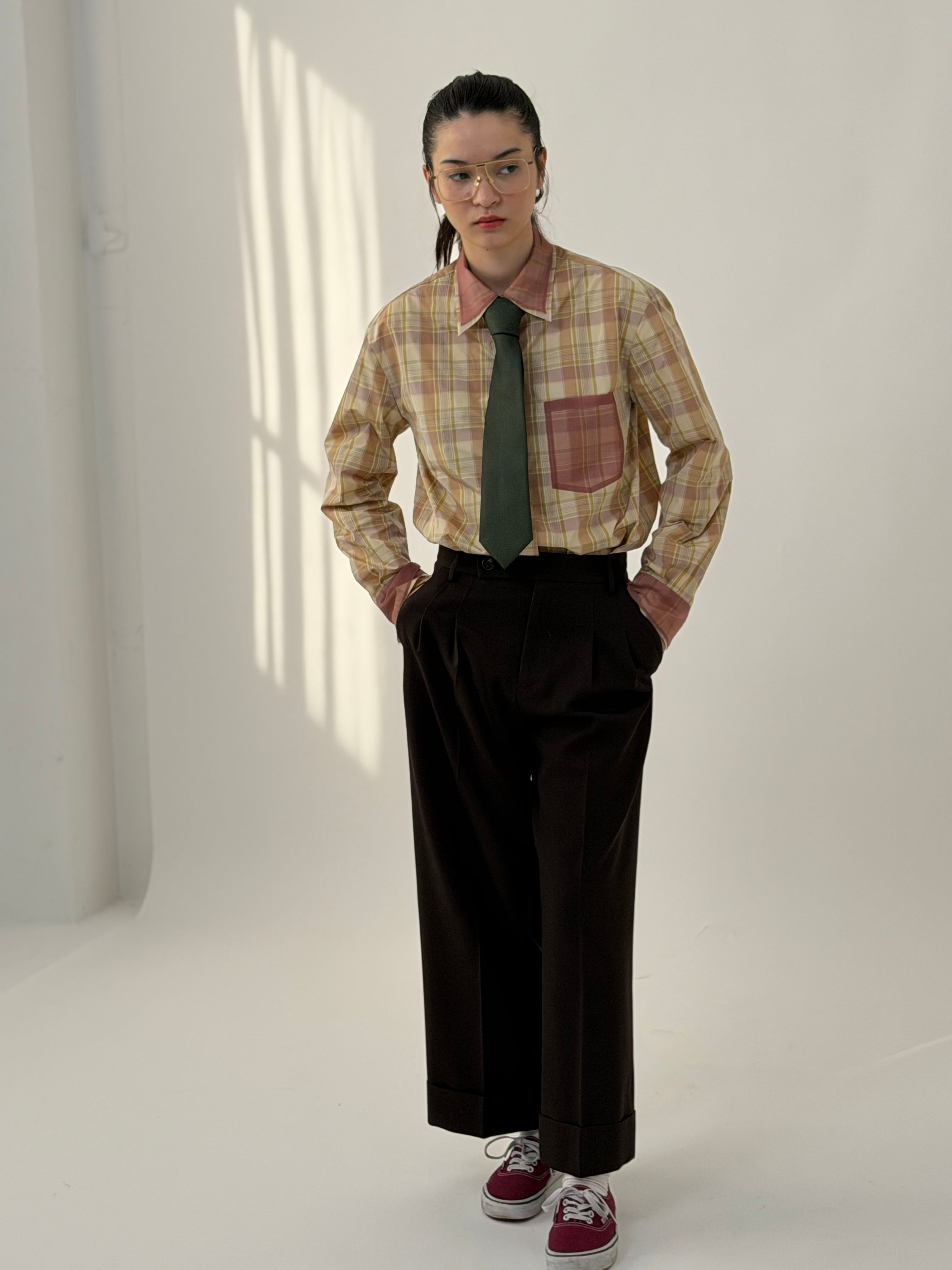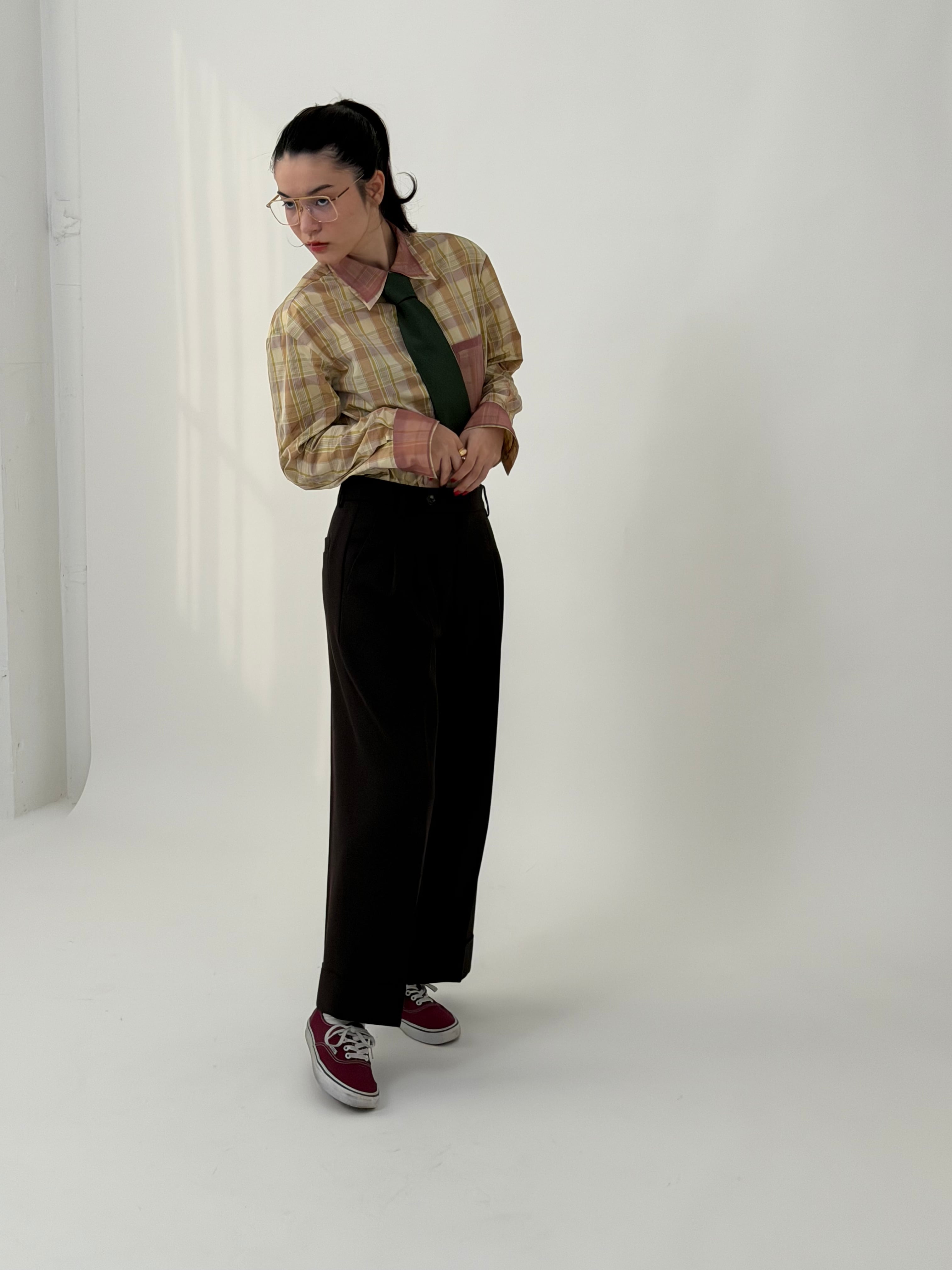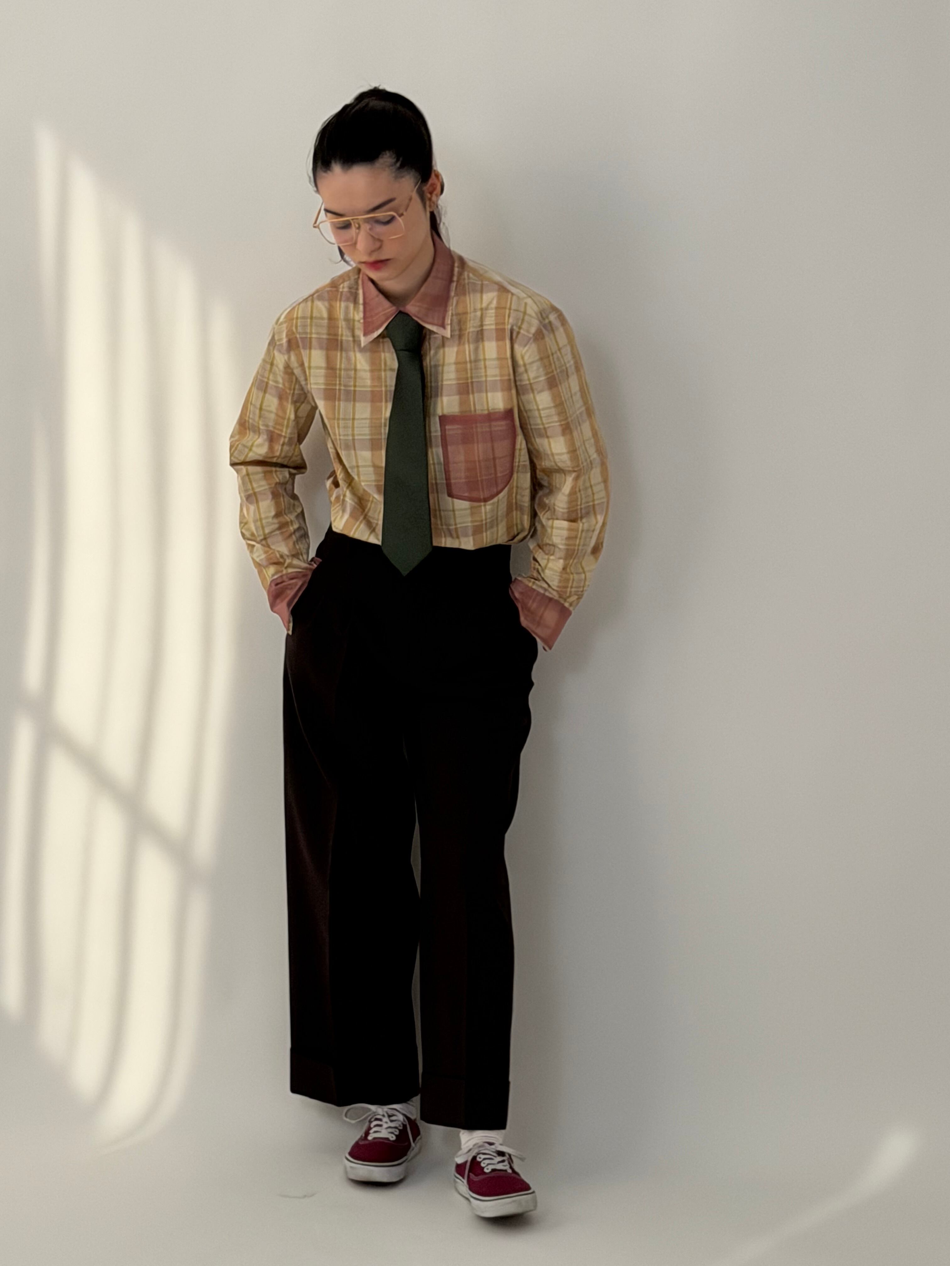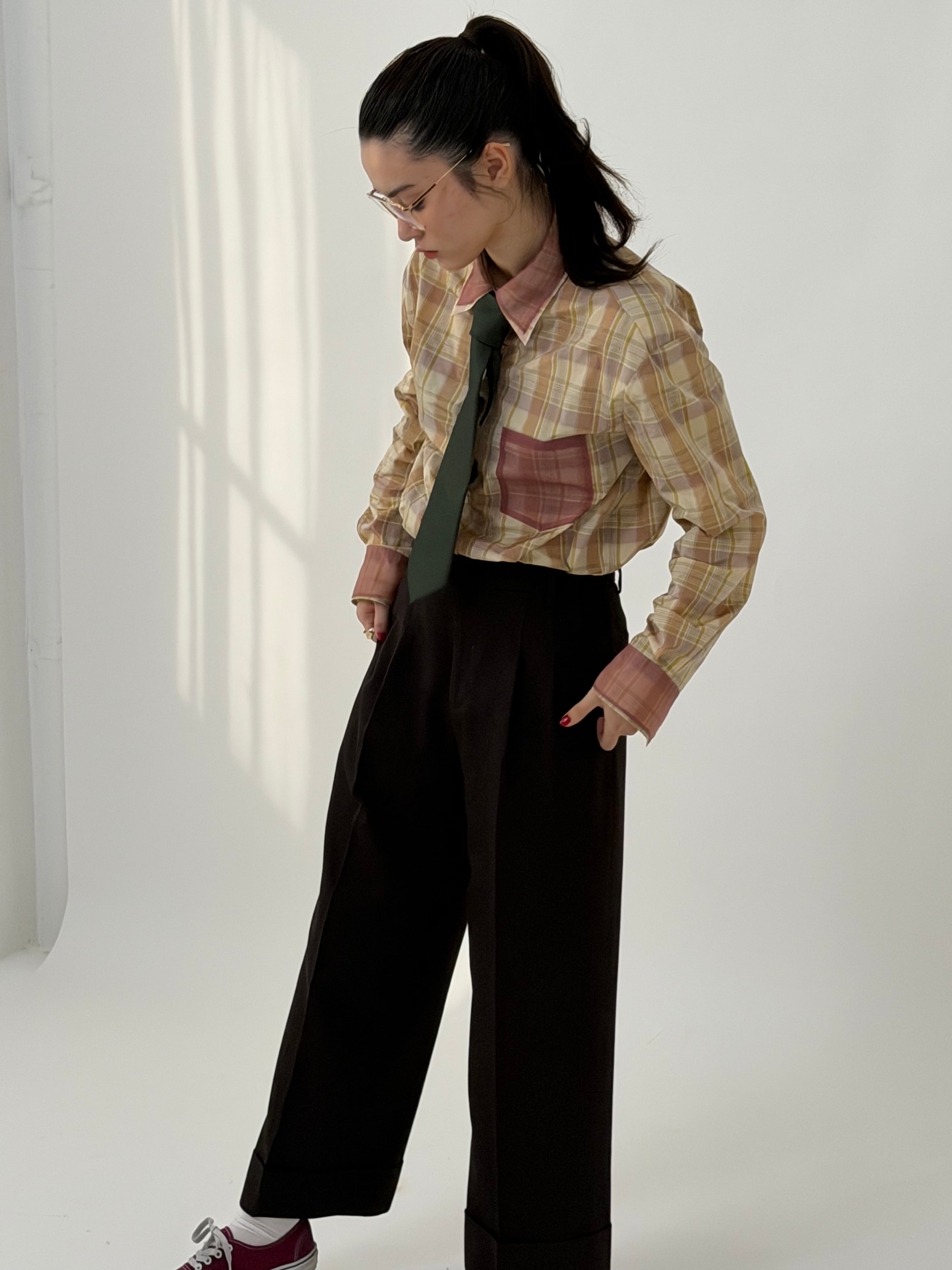 【ベルト通し付き】裏地付き price✴︎48000yen【税込】 color✴︎ブラウン size✴︎free ウエスト 74㎝ ヒップ 108㎝ 股下 66㎝ カリッとしたサマーウールを使用した、タックダブルパンツ。